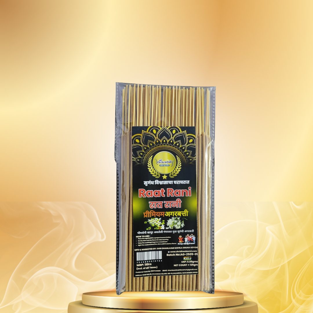 Raat Rani Agarbatti captures the essence of the beloved night-blooming jasmine, known for its intoxicating fragrance. Each stick is carefully blended with natural extracts to provide a mesmerizing floral scent that lingers for hours. Ideal for evening prayers, meditation, or enhancing the ambience of your living space.